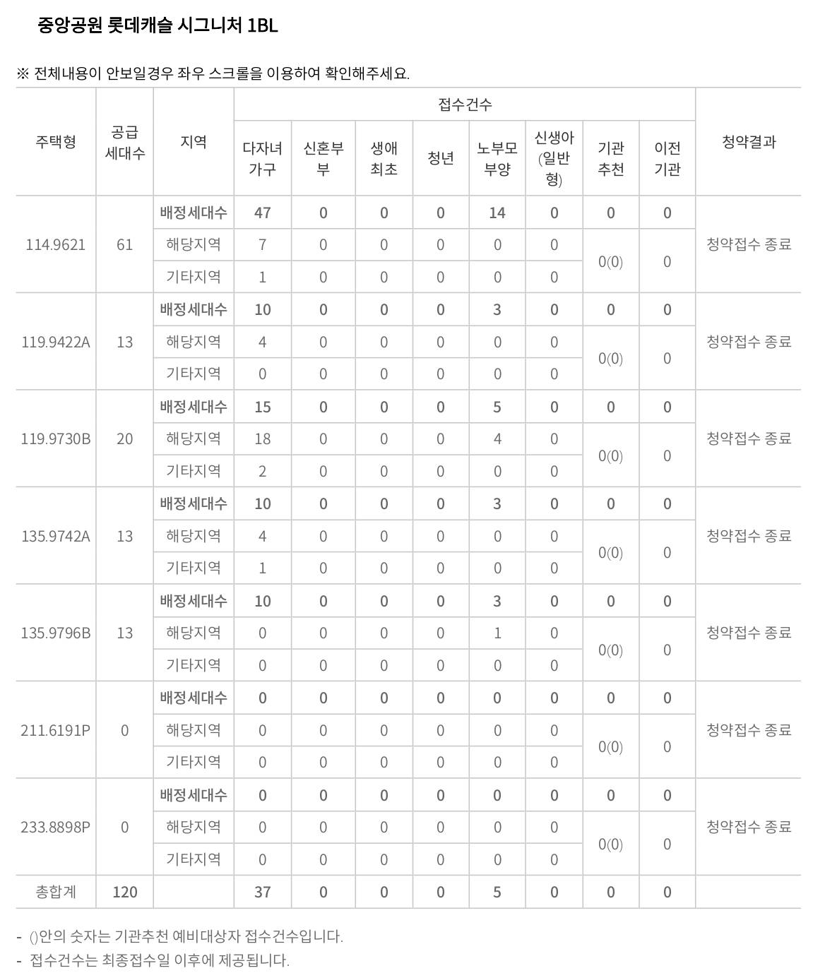 중앙공원 롯데캐슬 시그니처 특별공급이 2024년 4월 16일에 마감을 하였다. 1BL은 총 120세대 모집에 42세대밖에 신청을 하지 않았다. 1단지는 대형 평수 위주라서 그런 게 아닐까 생각해 본다. 그리고 요즘 대출금리도 만만치 않고 분양가도 상당하기 때문에 금전적인 문제가 가장 큰 문제가 아닐까라고도 생각이 간다.