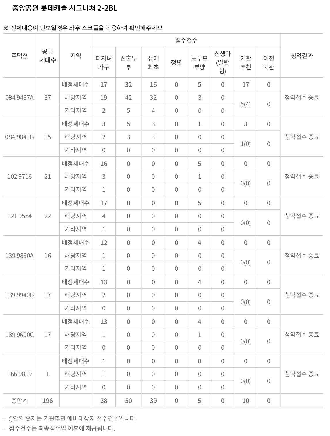 2-2BL 단지는 국평 84타입이 있는 단지라서 그런지 총 196세대 모집에 142세대가 신청을 하였고 84A타입은 노부모 부양, 기관추천을 제외한 다자녀가구 특별공급, 신혼부부특별공급, 생애최초특별공급에서 1:1을 넘으며 선방을 하고 있다.
